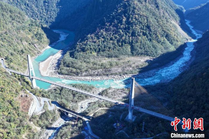 川藏公路西藏波密段昔日的“通麥天險”路段如今已被大橋及隧道取代,圖為12月18日,迫龍溝特大橋與帕隆藏布江。(無人機(jī)畫面)中新社記者 趙凜松 攝