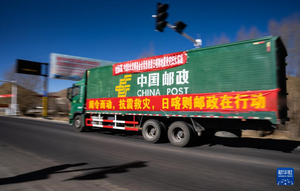 1月8日,在日喀則市境內(nèi)的318國道,中國郵政的抗震救災運輸車輛向災區(qū)方向駛?cè)?。新華社記者 丁增尼達 攝