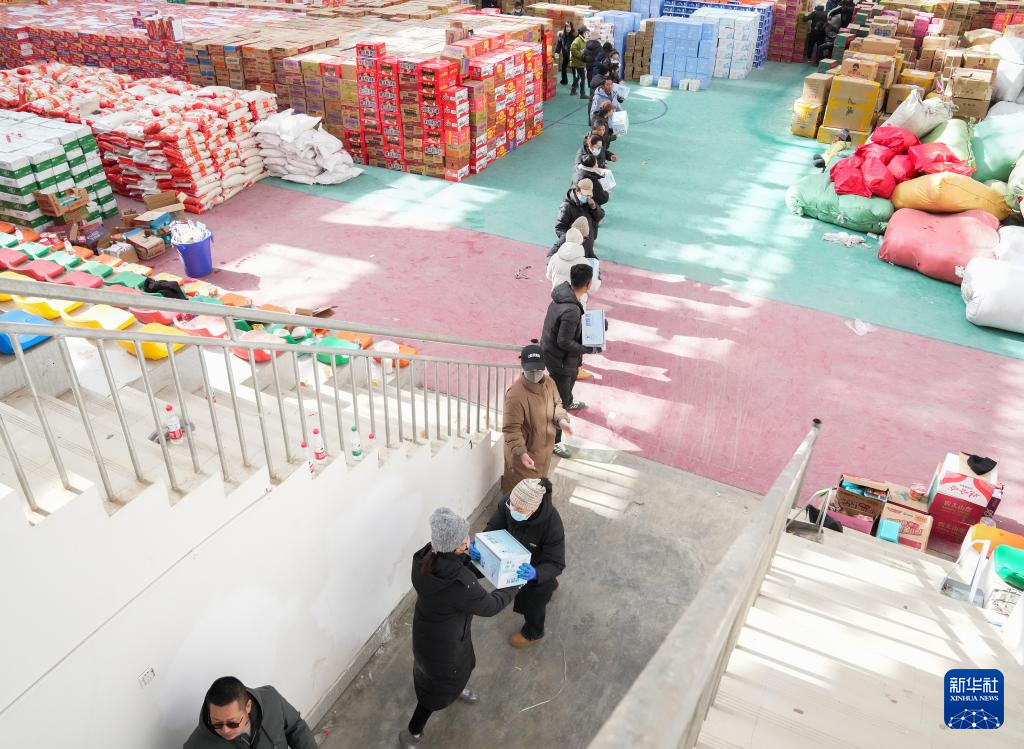 1月8日,在定日縣人民政府的救援物資點,干部群眾接力傳遞救援物資。新華社記者 丁汀 攝