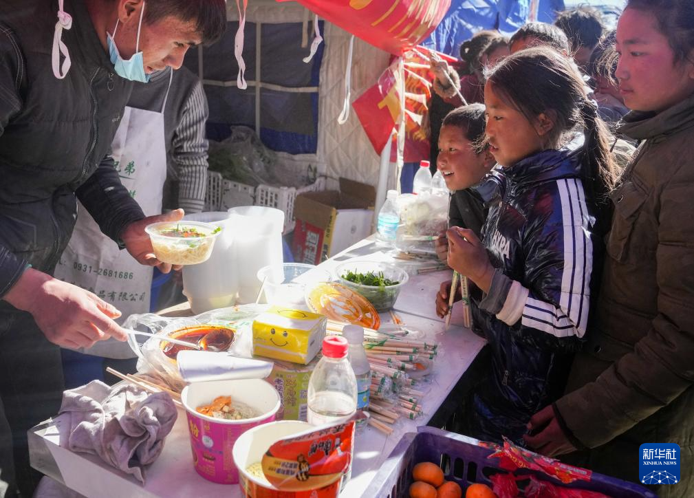 1月8日,在日喀則市定日縣長所鄉(xiāng)森嘎村的臨時安置點,馬仁(左一)為受災小朋友免費供應面食。據(jù)馬仁介紹,他來自定日縣,和朋友一起來臨時安置點為災區(qū)群眾免費提供面食。據(jù)悉,從7日下午兩點開始,他們已送出近1200份面食。新華社記者 丁汀 攝