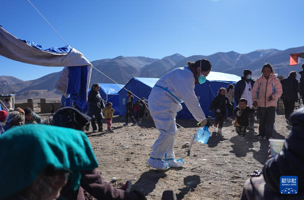 1月8日,在定日縣措果鄉(xiāng)野江村安置點,醫(yī)護人員進行消殺。新華社記者 晉美多吉 攝