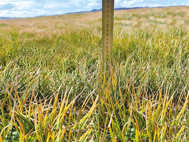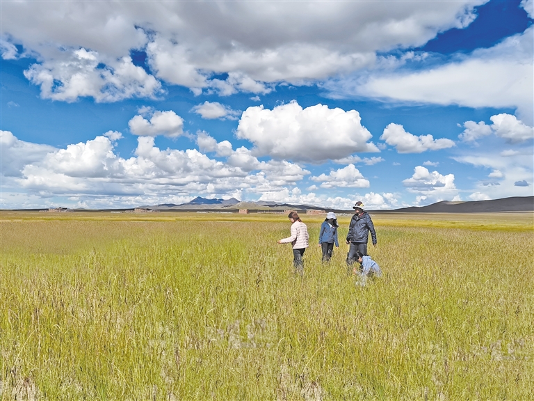 科研人員視察那曲市色尼區(qū)那么切鄉(xiāng)生態(tài)修復(fù)點(diǎn)牧草長勢情況。