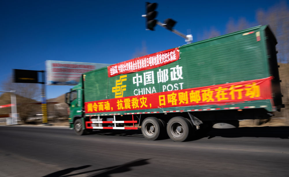 2025年1月8日,在日喀則,中國(guó)郵政的抗震救災(zāi)物資運(yùn)輸車輛向震中方向駛?cè)?。新華社記者 丁增尼達(dá) 攝