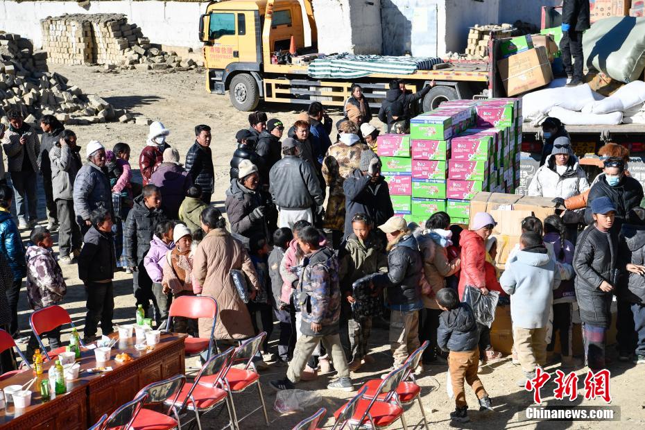 1月9日,西藏自治區(qū)定日縣曲洛鄉(xiāng)措昂村安置點,愛心企業(yè)為受災(zāi)民眾發(fā)放生活物資。當(dāng)日,位于西藏自治區(qū)定日縣曲洛鄉(xiāng)措昂村安置點,西藏各級救援人員和愛心企業(yè)不斷轉(zhuǎn)運、發(fā)放生活物資、搭建安置活動板房、全力保障受災(zāi)民眾的飲食供應(yīng)等,保障受災(zāi)民眾基本生活。中新社記者 貢嘎來松 攝