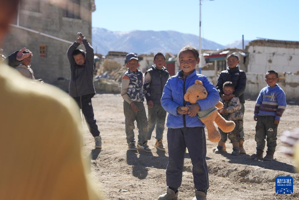 2025年1月8日,在日喀則市定日縣措果鄉(xiāng)塘仁村地震災后安置點,工作人員向孩子們贈送玩偶熊,并給他們表演節(jié)目。新華社記者 晉美多吉 攝