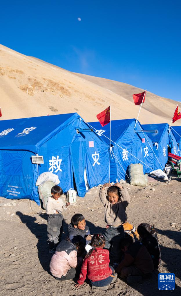 1月10日,在定結(jié)縣郭加鄉(xiāng)乃村安置點(diǎn),孩子們?cè)趯W(xué)生臨時(shí)學(xué)習(xí)區(qū)做游戲。新華社記者 丁增尼達(dá) 攝