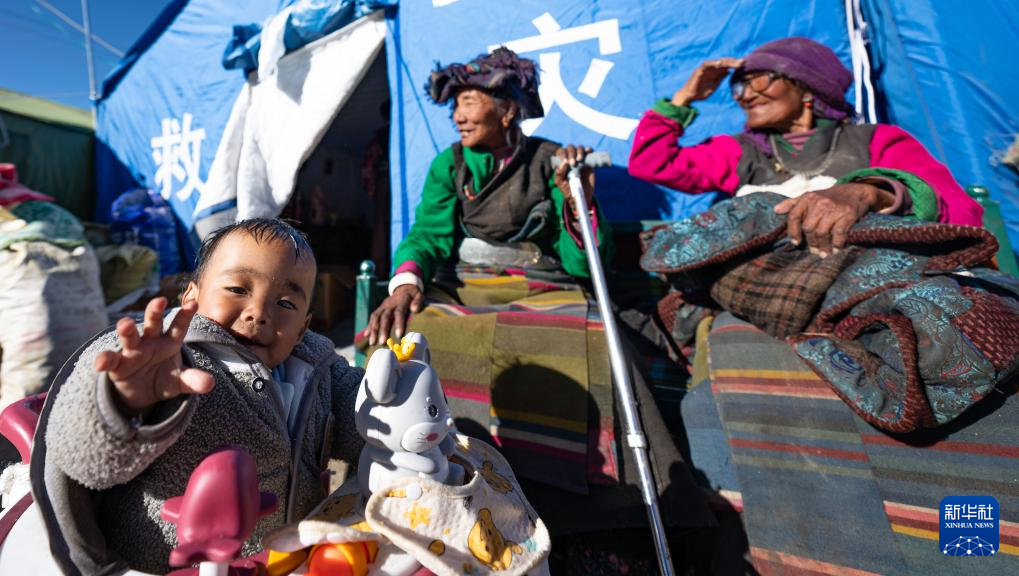 1月10日,在定結(jié)縣郭加鄉(xiāng)切村安置點(diǎn),老人和孩子在救災(zāi)帳篷前休息、曬太陽。新華社記者 丁增尼達(dá) 攝