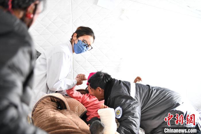 1月10日,西藏定日,醫(yī)護(hù)人員帶老人達(dá)娃的孫女去復(fù)查?!≈行律缬浾?貢嘎來松 攝