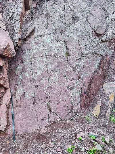 西藏昌都位于青藏高原東部,據(jù)介紹,此研究區(qū)的侏羅紀(jì)地層最大厚度超過4800米,巨大的沉積厚度促進(jìn)了大量化石的發(fā)現(xiàn),其中就包括恐龍足跡化石。2023年7月,中國地質(zhì)調(diào)查局自然資源實物地質(zhì)資料中心項目組于昌都開展工作時,在凍多村一段鄉(xiāng)村道路兩側(cè)的石壁上發(fā)現(xiàn)了疑似爬行動物腳印,隨即與遺跡學(xué)專家合作組成考察隊開展研究。該足跡化石點頂部為灰?guī)r,由紫紅色砂巖間夾頁巖、黏土巖組成,含有植物化石、遺跡化石和少許腕足、介形類和海百合莖等化石,總體屬于海陸交互環(huán)境??疾礻犜诳铸堊阚E所在層面與相鄰層面還發(fā)現(xiàn)了如古藻跡、石針跡等遺跡,這些發(fā)現(xiàn)代表這個地方曾是淺水環(huán)境。因此,研究證明,良好的環(huán)境和豐沛的水資源吸引了恐龍等動物在此活動,并留下豐富的足跡化石。