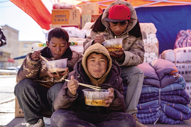 在長所鄉(xiāng)森嘎村安置點,來自定日縣崗嘎鎮(zhèn)的普桑和其他3名村民正在給受災(zāi)群眾與救援人員分發(fā)“巴突”(藏語音譯,意為面疙瘩)?!敖裉焐衔缥覀冏龅摹畯姎w’(藏語音譯,意為煮青稞酒和糌粑),中午做的‘巴突’,這是我們的傳統(tǒng)美食,吃了全身都會暖乎乎的。大家互幫互助,一切都會慢慢好起來的?!逼丈Uf。