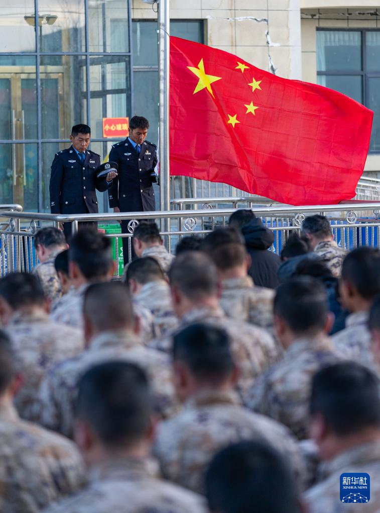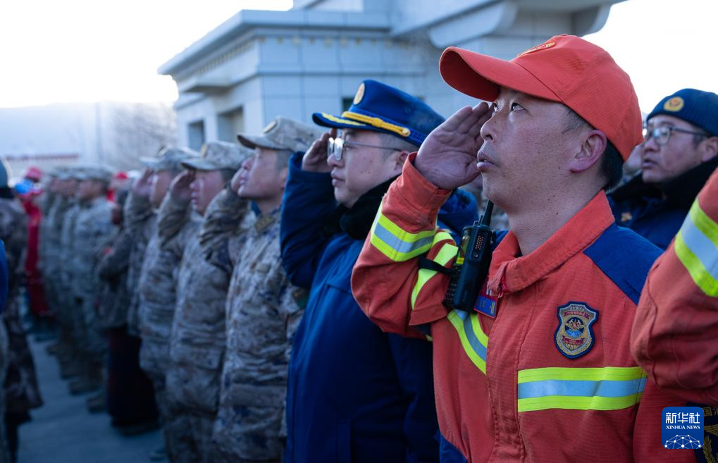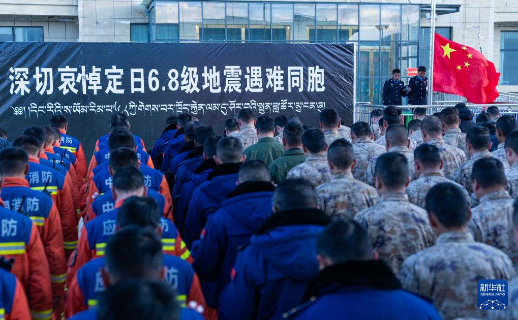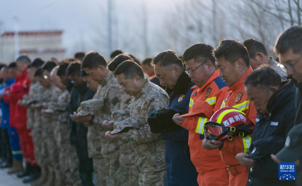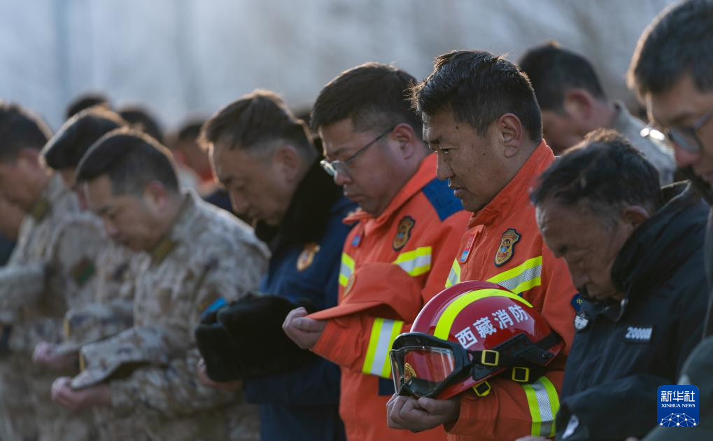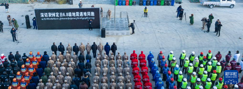 1月13日上午9時30分,西藏定日6.8級地震遇難同胞悼念儀式在受災最嚴重的長所鄉(xiāng)舉行。參與救援的解放軍和武警官兵、消防救援人員、公安民警、醫(yī)護人員、青年志愿者及有關企業(yè)員工、干部職工、震區(qū)群眾代表數(shù)百人,脫帽肅立,向遇難同胞默哀3分鐘。新華社記者 丁增尼達 攝