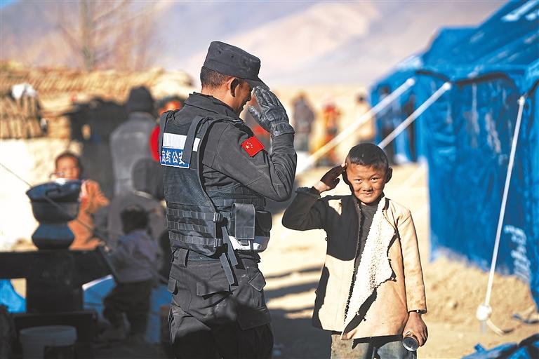 “照片上的這位民警是我們的同事,叫普次仁。1月9日,他在村里的臨時安置點巡邏的時候,看到一個小男孩,便將自己手中的飲料遞給他。沒想到這個叫達瓦扎西的小男孩很認真地給他敬了個禮?!倍ńY(jié)縣公安局應(yīng)急救援小分隊隊員高靜說,“照片是我在定日縣措果鄉(xiāng)吉翁村拍的?!?/p>