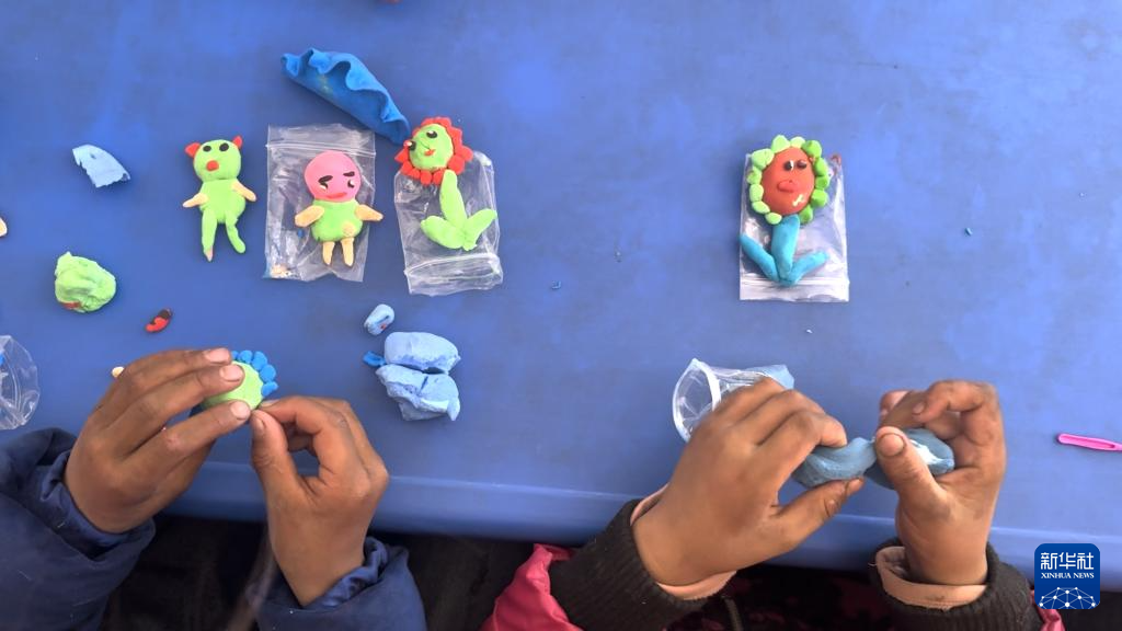 1月13日中午,在定日縣曲洛鄉(xiāng)措娃村安置點(diǎn)的兒童友好空間,孩子們?cè)谏绻ぶ笇?dǎo)下捏塑超輕黏土。新華社記者索朗德吉 攝