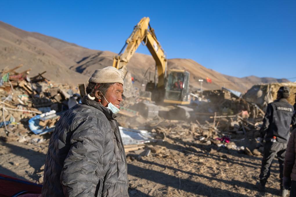 1月13日,在定日縣長所鄉(xiāng)古榮村,次仁扎西老人站在自家的廢墟前。新華社記者丁增尼達(dá) 攝