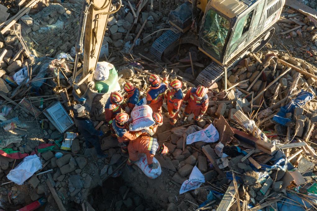 1月13日,在定日縣長所鄉(xiāng)古榮村,消防員們在搬運(yùn)從廢墟中搶救出的青稞(無人機(jī)照片)。新華社記者丁增尼達(dá) 攝