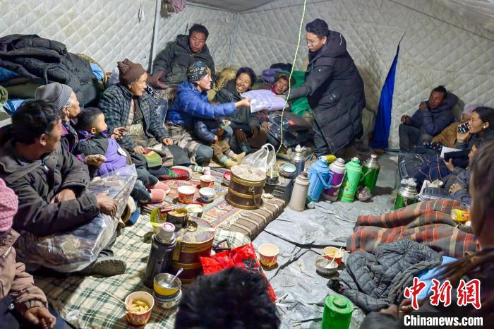 圖為1月11日,西藏定日6.8級(jí)地震后,鐵路職工桑杰尼瑪和村民們?cè)谝黄稹J茉L者 供圖