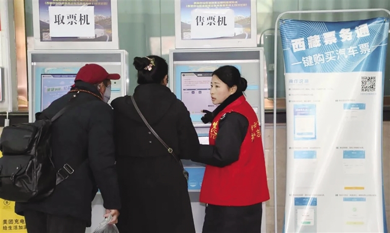 志愿者幫助旅客自助購(gòu)票。圖由西藏自治區(qū)交通運(yùn)輸廳提供