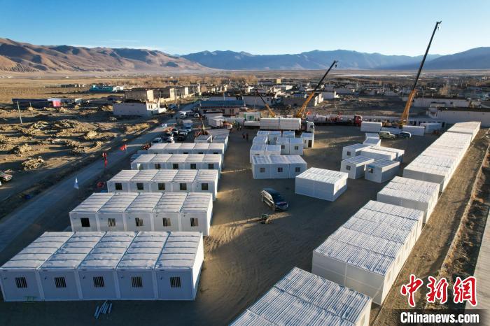 圖為1月10日,西藏定日縣長所鄉(xiāng)森嘎村正搭建移動板房。(無人機(jī)畫面)江飛波 攝