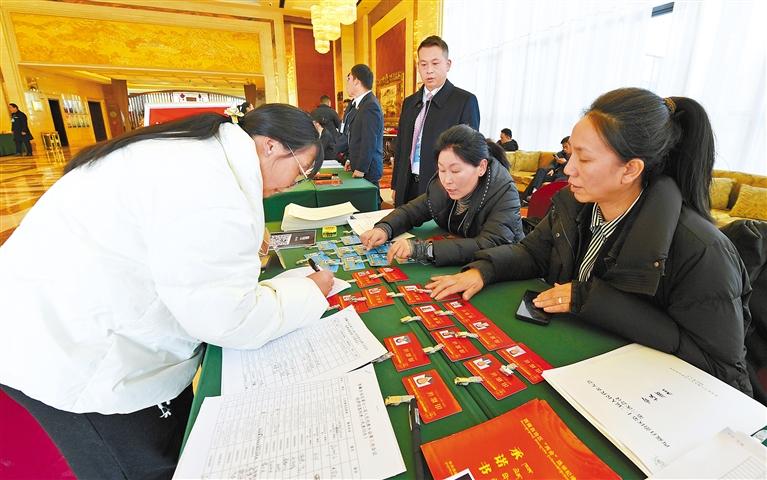 圖為1月16日,參加自治區(qū)十二屆人大三次會議的人大代表向大會報到。記者 唐斌 洛桑 攝