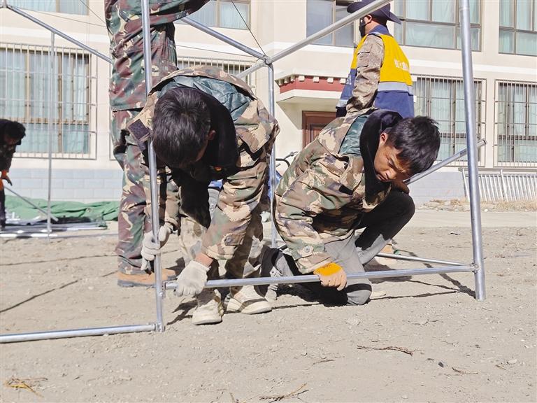 1月13日,拉孜縣芒普鄉(xiāng),4名身穿迷彩大衣的青年,正在救災(zāi)物資間穿梭,稚嫩的臉上帶著與年齡不相符的沉穩(wěn)與堅(jiān)毅。