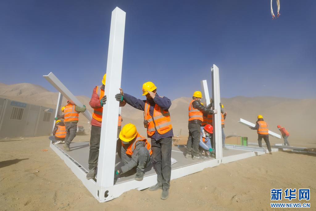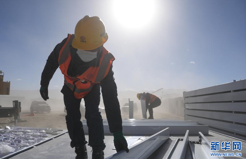 1月9日,中鐵二十局施工人員頂著風(fēng)沙在長(zhǎng)所鄉(xiāng)森嘎村安裝活動(dòng)板房 。新華社記者 晉美多吉 攝