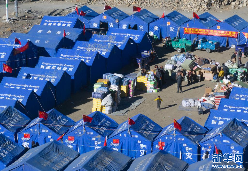1月10日,在定日縣民族團(tuán)結(jié)廣場(chǎng),人們搬運(yùn)將要運(yùn)往受災(zāi)群眾安置點(diǎn)的過(guò)冬物資。新華社記者 沈伯韓 攝