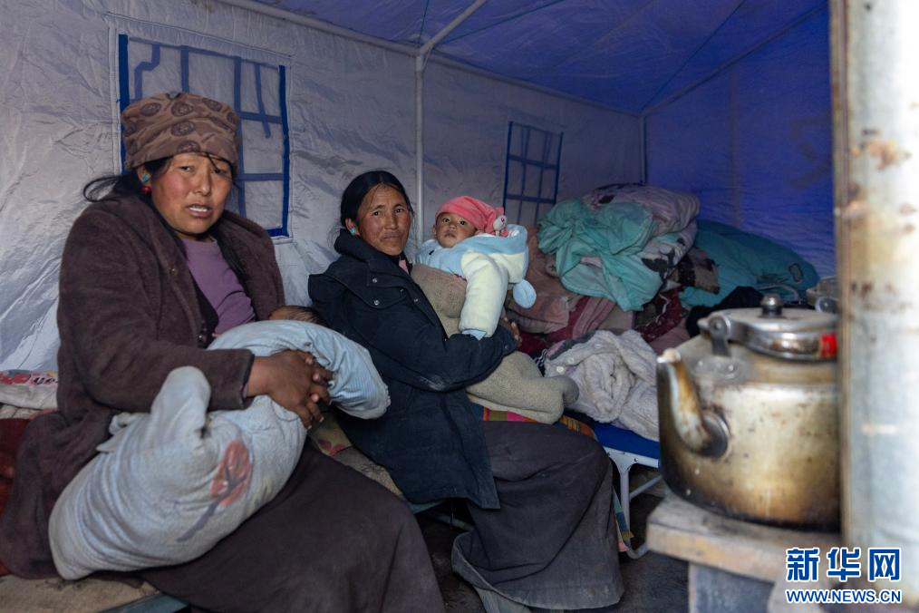 1月7日,兩位抱著孩子的受災(zāi)群眾在拉孜縣曲下鎮(zhèn)土林村的應(yīng)急帳篷里取暖。新華社記者 姜帆 攝