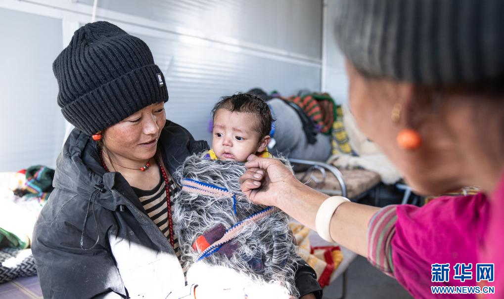 1月8日,定日縣長(zhǎng)所鄉(xiāng)通來(lái)村的受災(zāi)群眾措姆抱著自己的孩子在領(lǐng)取志愿者送來(lái)的御寒衣物。新華社記者 姜帆 攝