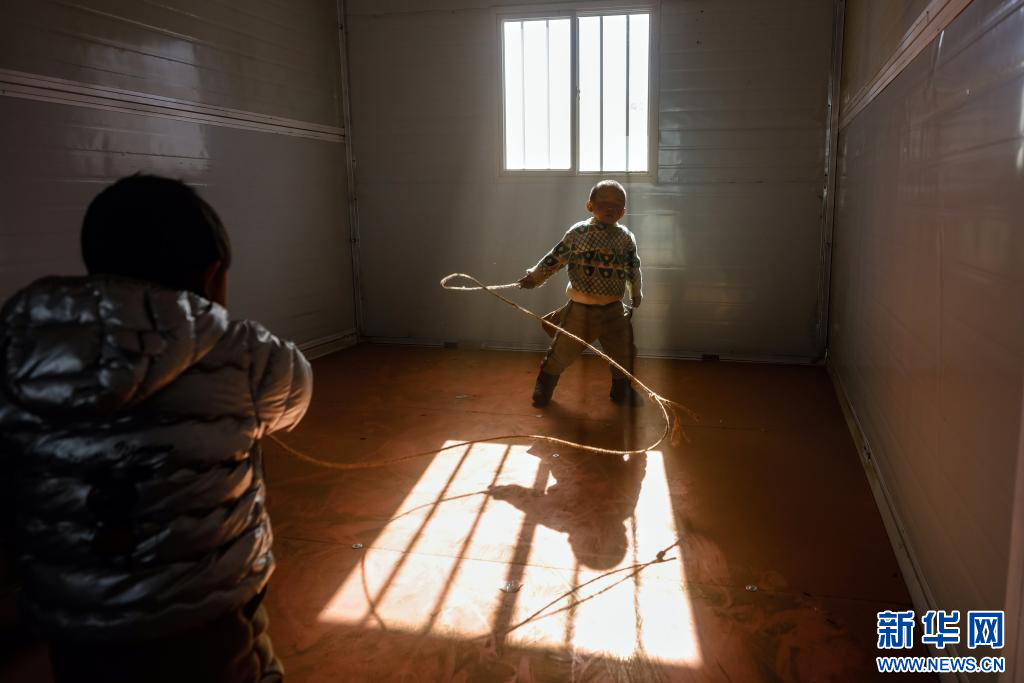 1月10日,在定日縣長(zhǎng)所鄉(xiāng)古榮村,兩名小朋友在搬入的板房?jī)?nèi)玩耍。新華社記者 沈伯韓 攝