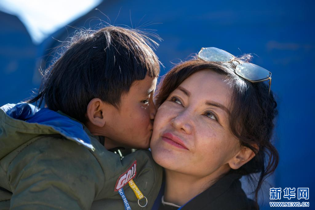 1月11日,在定日縣曲洛鄉(xiāng)措昂村的受災(zāi)群眾安置點(diǎn),一名藏族女孩親吻中國(guó)科學(xué)院心理研究所應(yīng)急心理救援隊(duì)的專家譚惜仁(右)。新華社記者 沈伯韓 攝