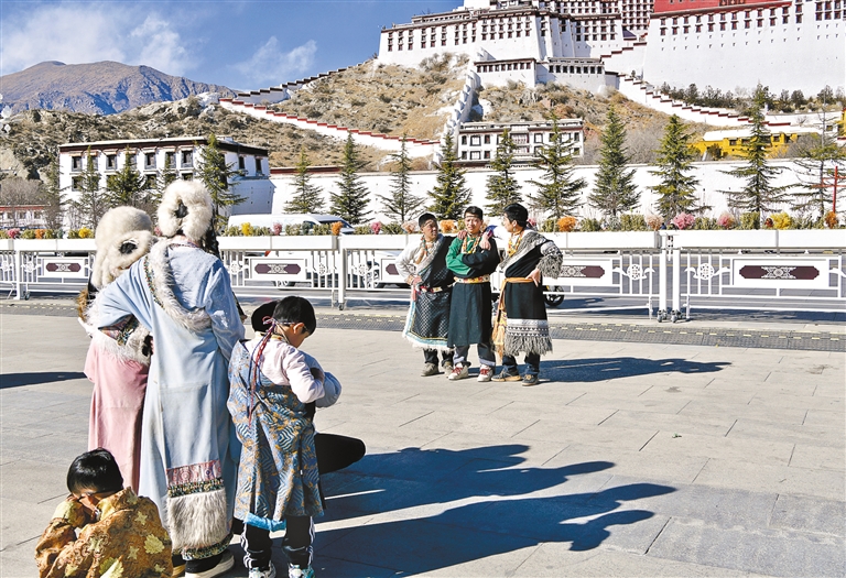 游客在布達(dá)拉宮廣場(chǎng)拍照留念。記者 王敏 攝