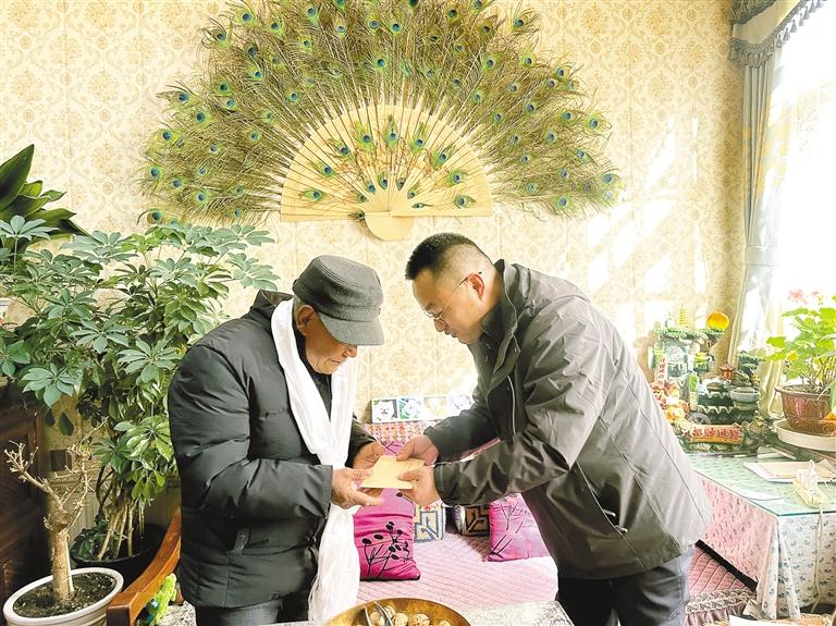 圖為拉薩市人民政府辦公室相關負責人為離退休干部職工敬獻哈達并送上慰問金。記者 劉琳琳 攝
