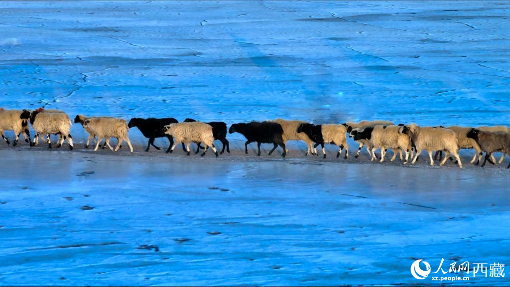 隨著一聲號(hào)令,牧民們驅(qū)趕著羊群,踏上冰封的湖面。遠(yuǎn)遠(yuǎn)望去,羊群如同一串串黑白相間的珍珠,在湛藍(lán)的冰面上緩緩移動(dòng),構(gòu)成一幅壯美的高原畫(huà)卷。