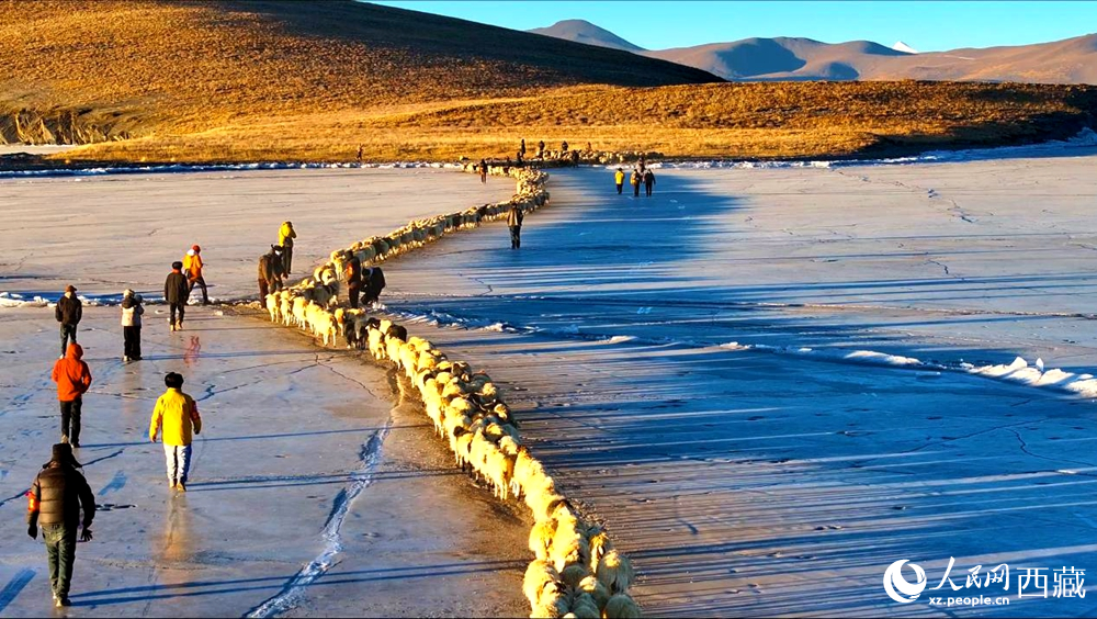 普莫雍錯(cuò)“冰上趕羊”,是當(dāng)?shù)啬撩袷来鄠鞯墓爬现腔?。每年冬季,由于推瓦村海拔高、夏季短,草?chǎng)無(wú)法為羊群提供充足的過(guò)冬飼料。因此,每年高原最冷的時(shí)候,推瓦村牧民會(huì)把羊群趕到普莫雍錯(cuò)水草豐茂的湖心島,依靠島上的草料度過(guò)最寒冷的冬期。