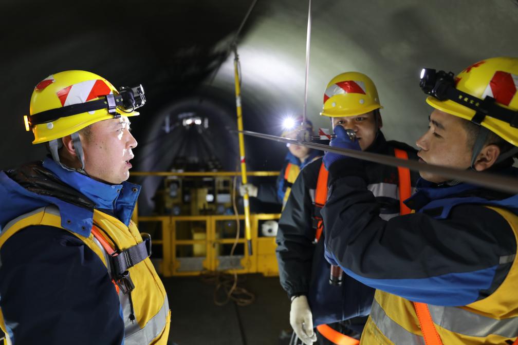 春運(yùn)期間,接觸網(wǎng)工人劉海軍(左)和王有壽(右)在拉林鐵路色拉丘隧道內(nèi)為接觸網(wǎng)加固吊弦。(拉巴次仁攝)