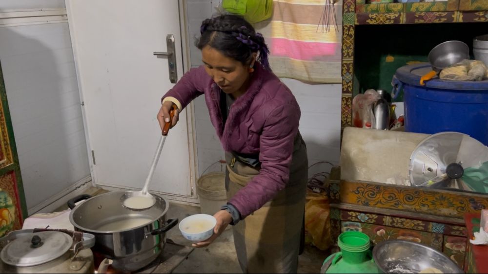 2月27日,阿旺次仁的妻子拉巴普尺正在盛“古突”。新華社記者 蔣夢辰 攝