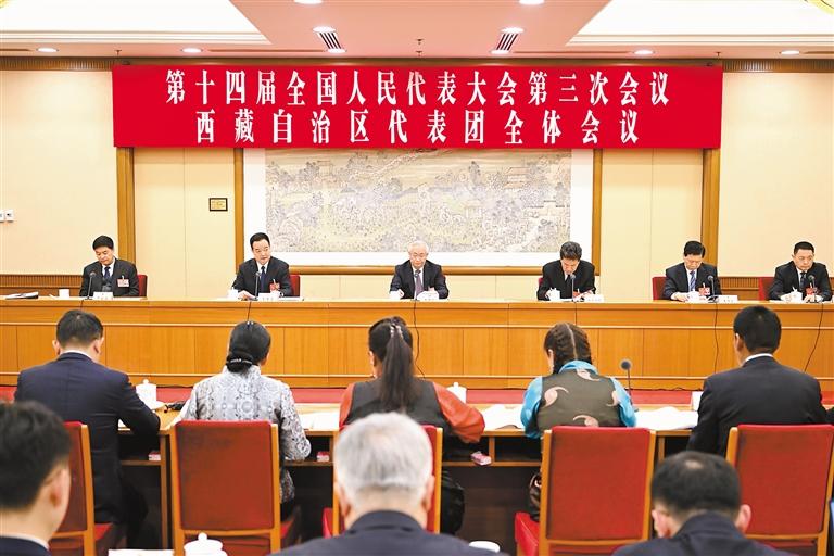 3月5日下午,十四屆全國人大三次會(huì)議西藏代表團(tuán)舉行全體會(huì)議,審議政府工作報(bào)告。