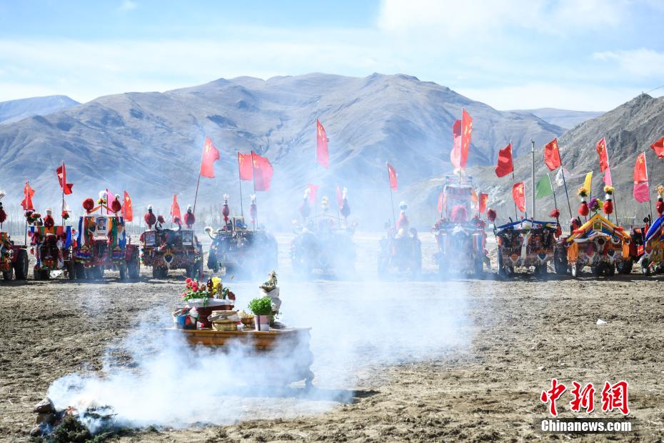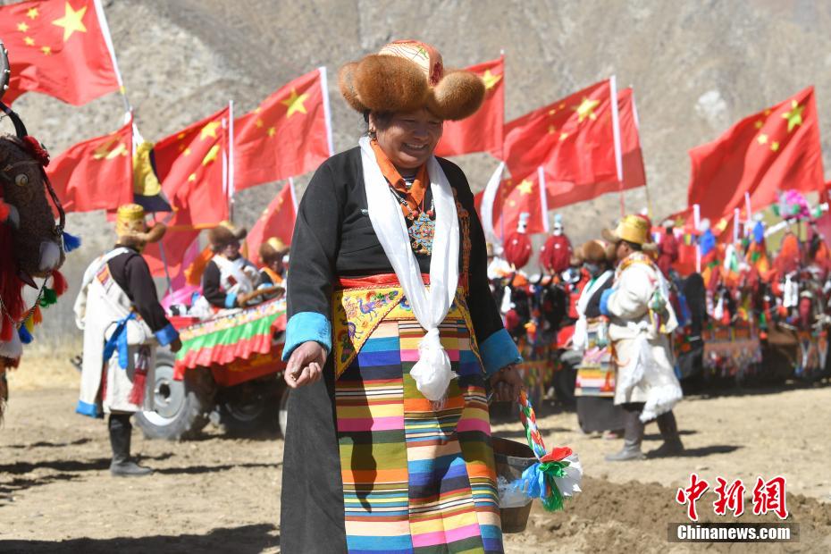 3月16日,西藏拉薩迎來一年一度的傳統(tǒng)春耕儀式。當日,拉薩市曲水縣色達村村民身著節(jié)日盛裝,相聚在田間,載歌載舞,共同迎接春耕第一犁。家家戶戶端著自家的“切瑪”(象征五谷豐登)帶著青稞酒、酥油茶等物品聚在田間,互敬青稞酒,開始撒種,祈求全年風(fēng)調(diào)雨順、五谷豐登。圖為曲水縣色達村春耕儀式現(xiàn)場,當?shù)孛癖姳硌菸璧浮栋⒓诎汀贰?span>中新社記者 貢嘎來松 攝