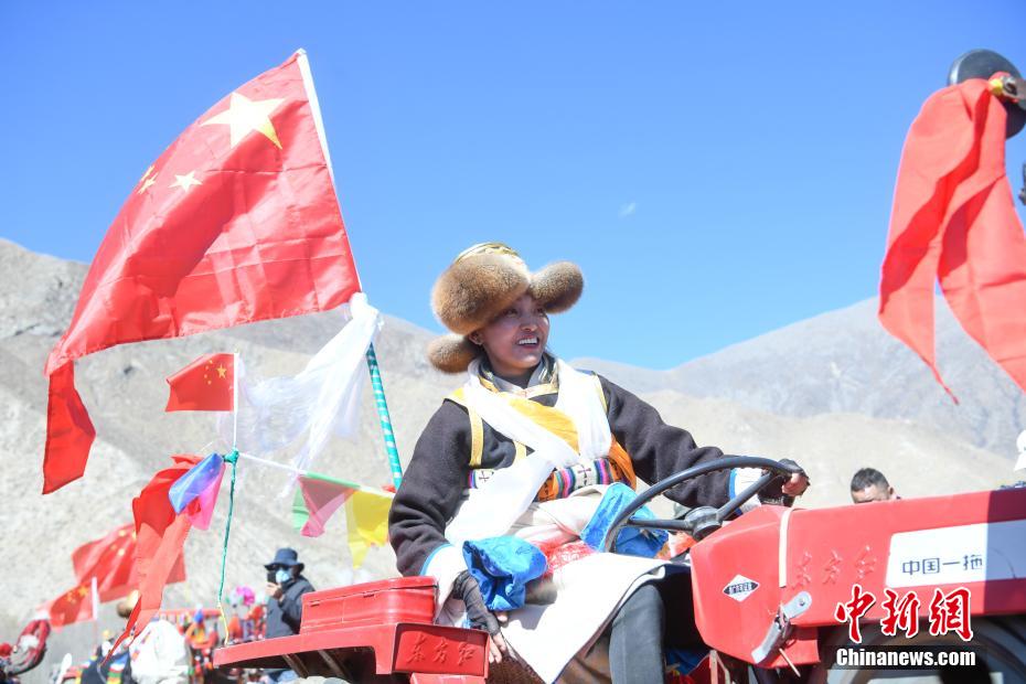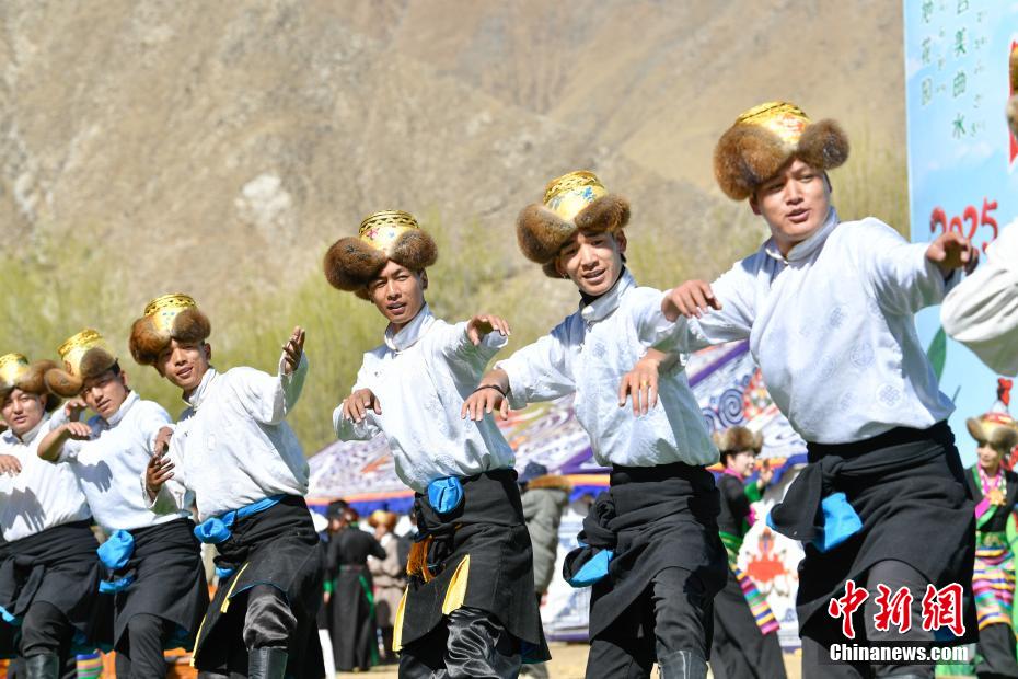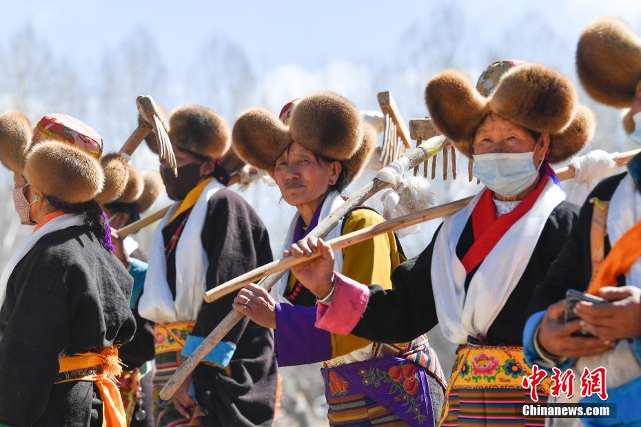 3月16日,西藏拉薩迎來一年一度的傳統(tǒng)春耕儀式。當日,拉薩市曲水縣色達村村民身著節(jié)日盛裝,相聚在田間,載歌載舞,共同迎接春耕第一犁。家家戶戶端著自家的“切瑪”(象征五谷豐登)帶著青稞酒、酥油茶等物品聚在田間,互敬青稞酒,開始撒種,祈求全年風(fēng)調(diào)雨順、五谷豐登。圖為曲水縣色達村春耕儀式現(xiàn)場,當?shù)孛癖姳硌輫壹壏俏镔|(zhì)文化遺產(chǎn)《吉祥仲孜》。中新社記者 貢嘎來松 攝