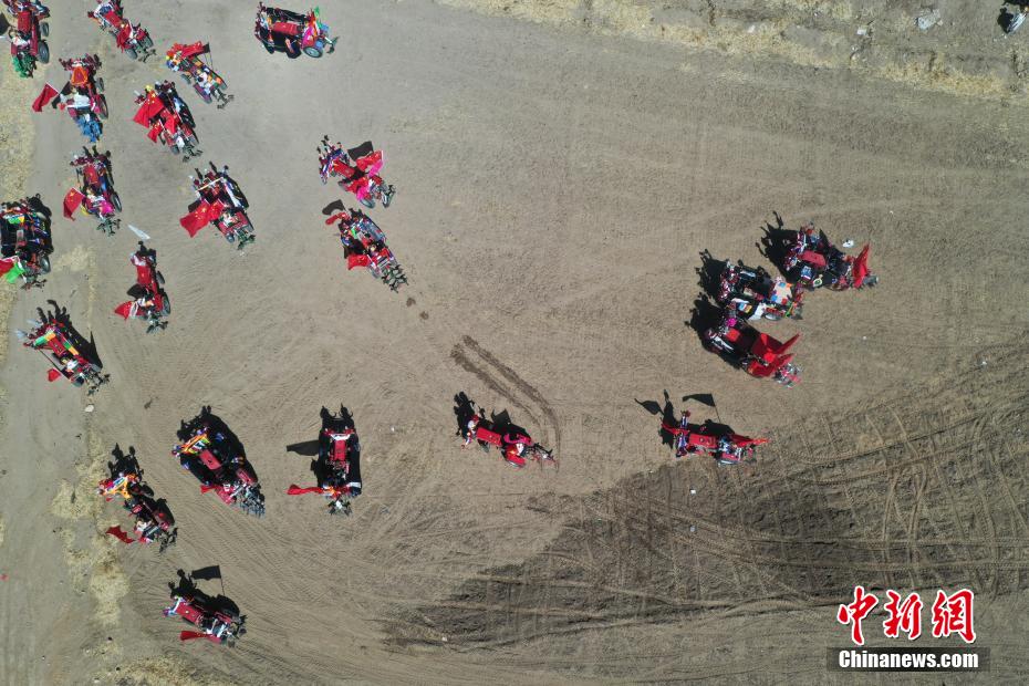 3月16日,西藏拉薩迎來一年一度的傳統(tǒng)春耕儀式。當日,拉薩市曲水縣色達村村民身著節(jié)日盛裝,相聚在田間,載歌載舞,共同迎接春耕第一犁。家家戶戶端著自家的“切瑪”(象征五谷豐登)帶著青稞酒、酥油茶等物品聚在田間,互敬青稞酒,開始撒種,祈求全年風(fēng)調(diào)雨順、五谷豐登。圖為曲水縣色達村春耕儀式現(xiàn)場(無人機照片)。中新社記者 貢嘎來松 攝