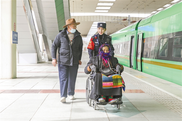 “格桑梅朵”女子乘務(wù)組乘警護送老年旅客安全乘車。