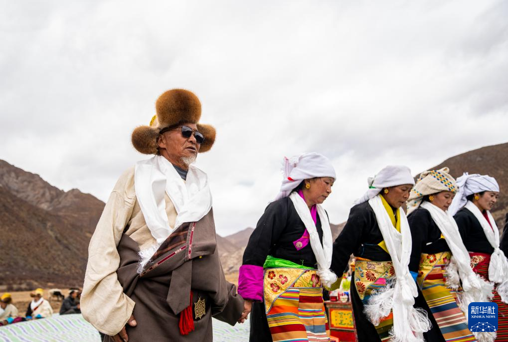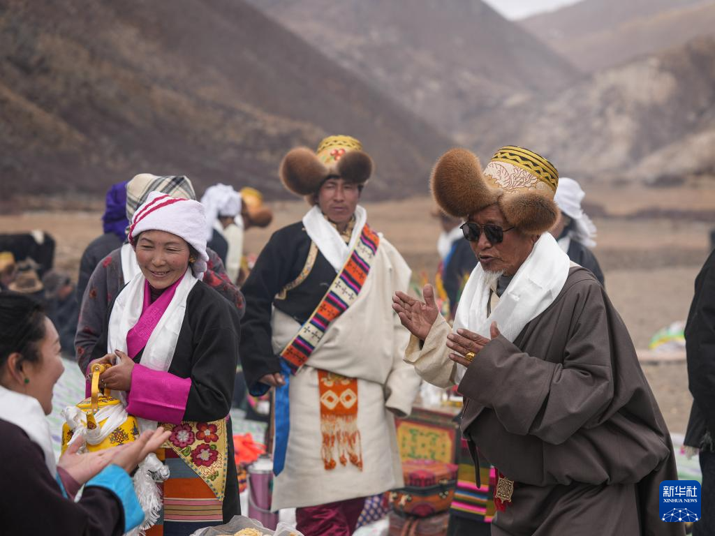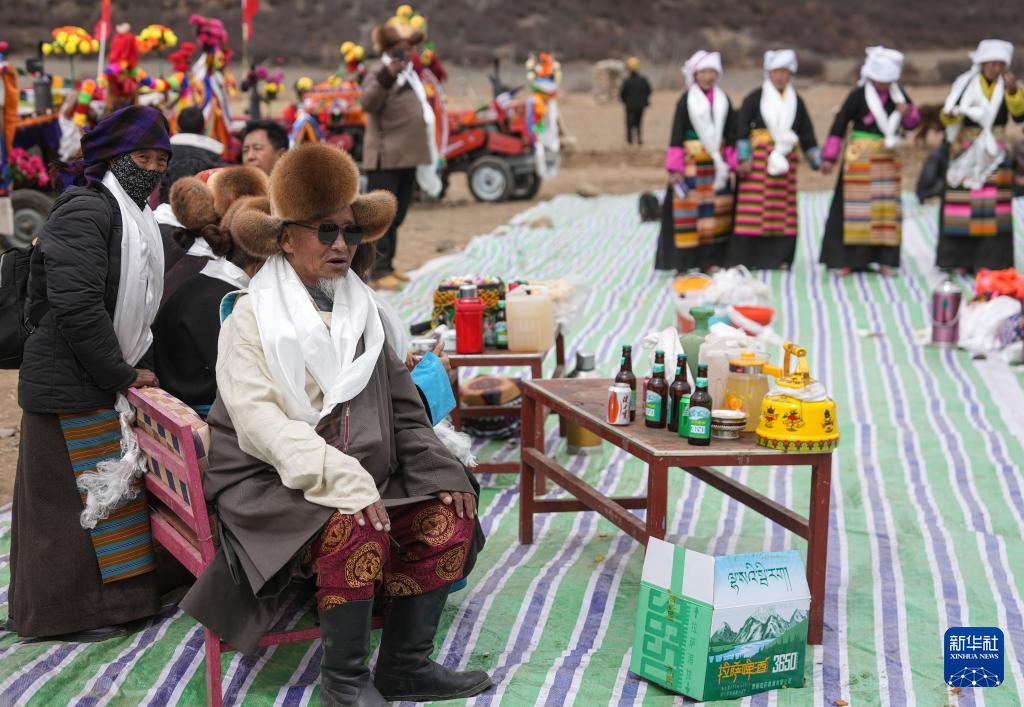 旺慶老人(右)在春耕大典上為客人敬酒獻唱(3月16日攝)。新華社記者 晉美多吉 攝