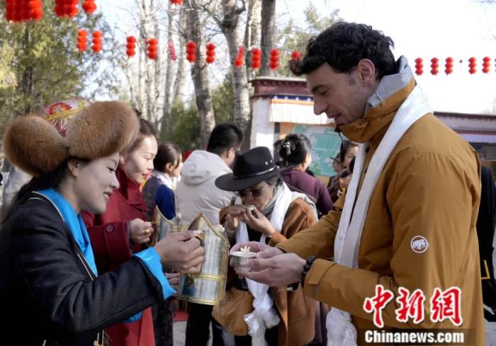 2025年2月28日是2025年藏歷木蛇新年的第一天。圖為外國游客在西藏拉薩市羅布林卡內品嘗青稞酒。中新社記者 李林 攝