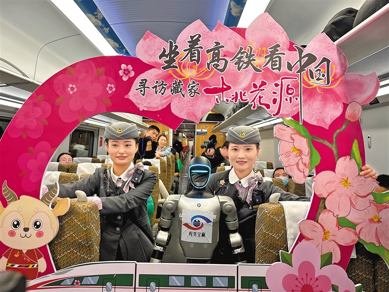 圖為拉林鐵路復興號動車組乘務(wù)員與機器人多吉合影。記者 文鳳 通訊員 馬生明 攝