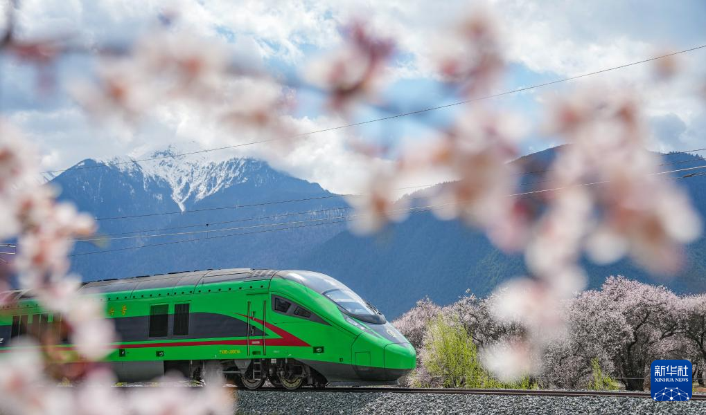 當(dāng)列車(chē)駛?cè)肓种ゾ硟?nèi),桃花的盛景會(huì)達(dá)到高潮,野生桃花漫山遍野。車(chē)在花中跑,人在畫(huà)中游,馳騁的復(fù)興號(hào)動(dòng)車(chē)與鐵道旁盛開(kāi)的桃花構(gòu)成了一幅人與自然和諧共生的畫(huà)卷。“第一次看到復(fù)興號(hào)從眼前飛馳而過(guò),就像看見(jiàn)家鄉(xiāng)的雄鷹掠過(guò)雪山?!绷种フ景矙z員德吉拉姆說(shuō)。