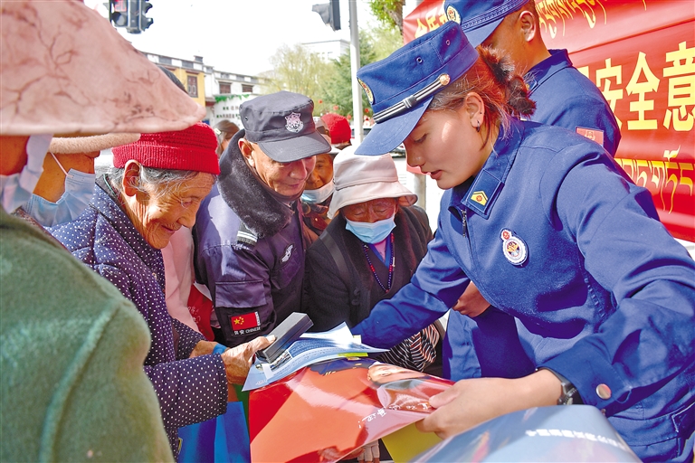 4月15日,山南市瓊結縣組織開展第十個全民國家安全教育日系列宣傳活動。圖為瓊結縣消防救援大隊工作人員向群眾發(fā)放宣傳資料。記者 孫開遠 攝