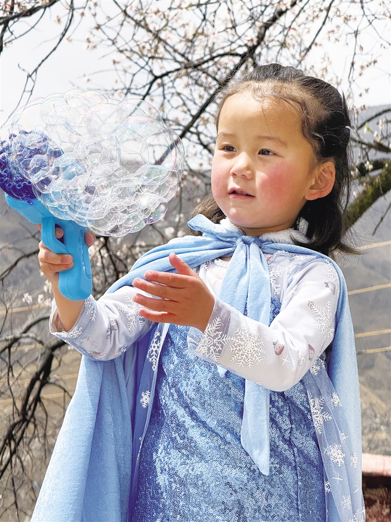 清明假期,小朋友在帕崩崗與桃花合影。記者 德吉曲珍 攝