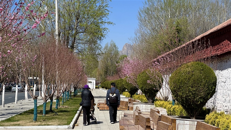 這幾條路相連接,一路都是榆葉梅、紫葉李、桃樹等,成團(tuán)成簇的花朵裝點(diǎn)著街道,綠化帶里的蒲公英也冒出頭來,小黃花零星綻放。一路走來,有看不完的花,賞不完的景。你只需放慢腳步,便能在最常走的路上,邂逅拉薩明媚的春光。