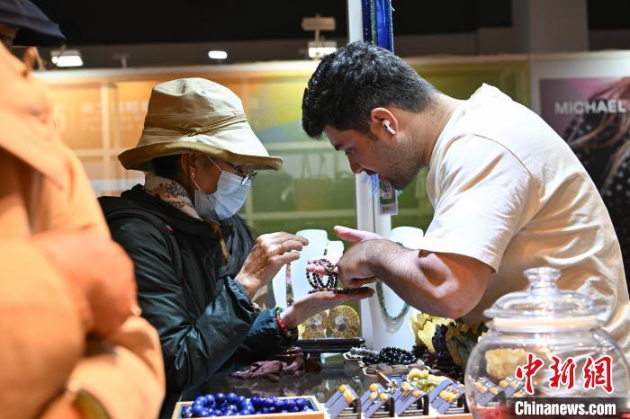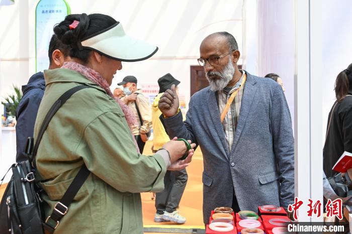 圖為拉薩進口商品展覽會現(xiàn)場,巴基斯坦商人(右)向顧客介紹、推銷手鐲。中新社記者 貢嘎來松 攝
