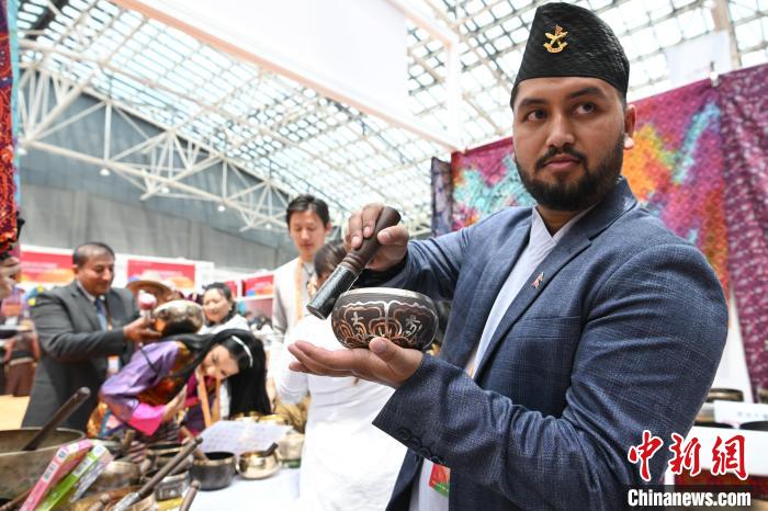 圖為拉薩進口商品展覽會現(xiàn)場,尼泊爾商人介紹、推銷自己的商品。中新社記者 貢嘎來松 攝